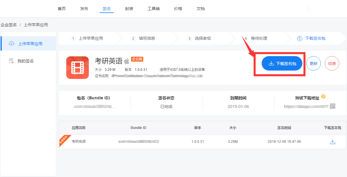 第五步、签名完成,下载签名包。将签名好的包,上传到发布页,即可获得正式下载链接和二维码。